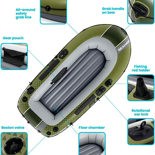 | سایر ویژگی ها | وزن بسته بندی: 15.3 کیلوگرم دارای سطح نشیمنگاه مواج دارای دو نشیمنگاه بادی دارای رویه ضد اشعه آفتاب دارای کیسه مخصوص حمل وسیل های کوچک دارای اهرم ماهیگیری |